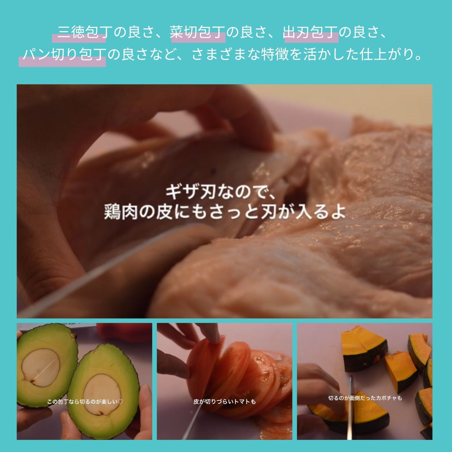 使いやすい三徳包丁の良さ、包丁の幅が広く野菜などが切りやすい菜切包丁の良さ、刃の部分がしっかりしていて魚をさばくのに便利な出刃包丁の良さ、パンが切りやすいパン切り包丁の良さなど、さまざまな特徴を活かした仕上がり。