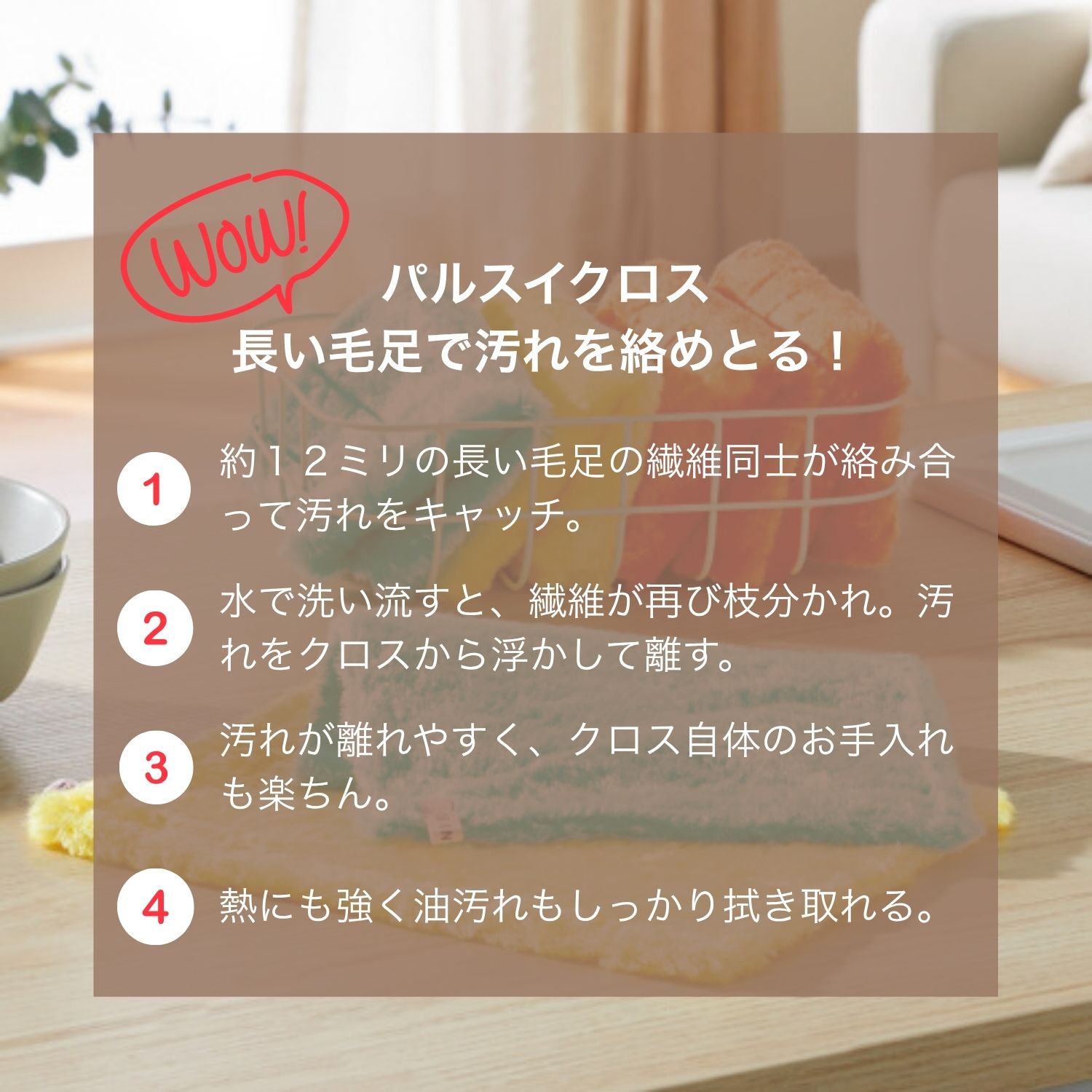 約12ミリの長い毛足で汚れを絡め取り、水で洗い流すと汚れが離れやすく、クロス自体のお手入れも簡単な「パルスイクロス」のご紹介です。