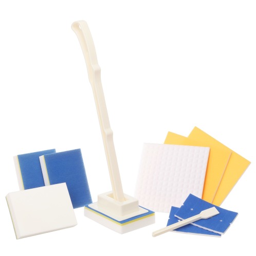 面積の広い場所や高い場所、細かい場所など必要に応じて、セットのアタッチメントや専用スティックを取り付けてお使いいただけます。また、アタッチメントと柄部は脱着ができるので、アタッチメントのみとエコメラミンスポンジとの組み合わせでタワシのように楽に使うこともできます。