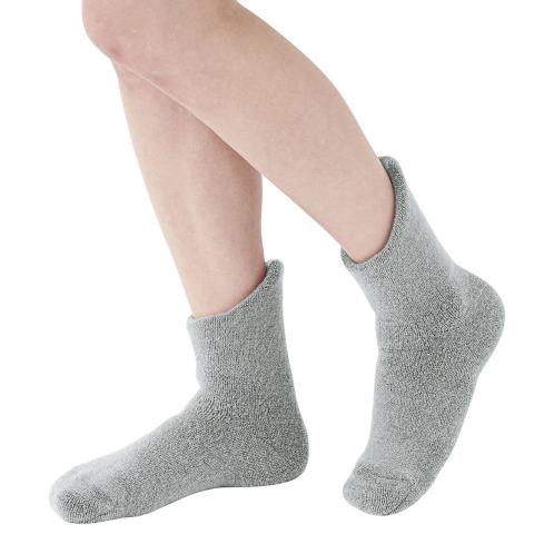 つまんでらくらく履ける形状。パイル編み構造なので、締め付け感が少なく、跡も付きにくくなっています。