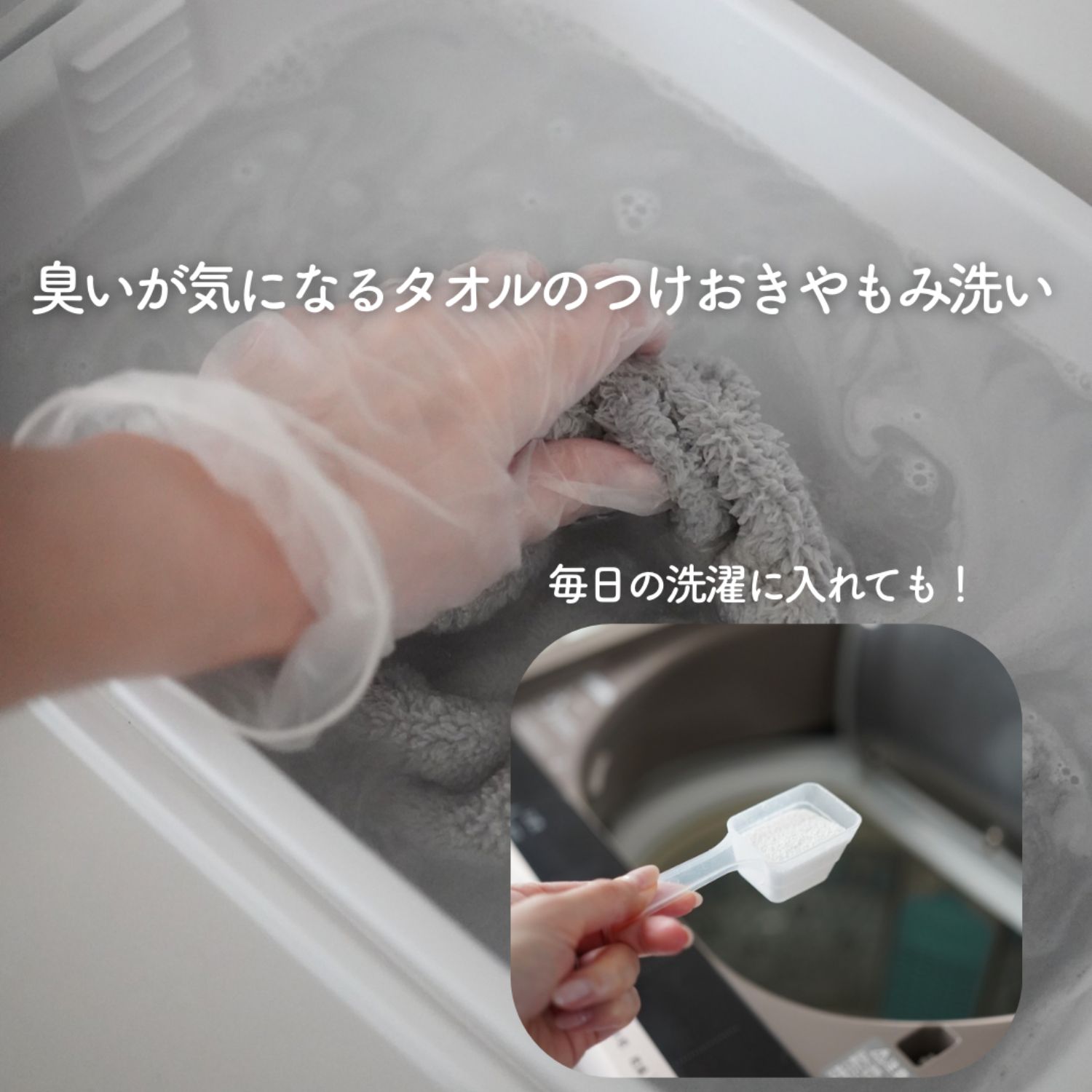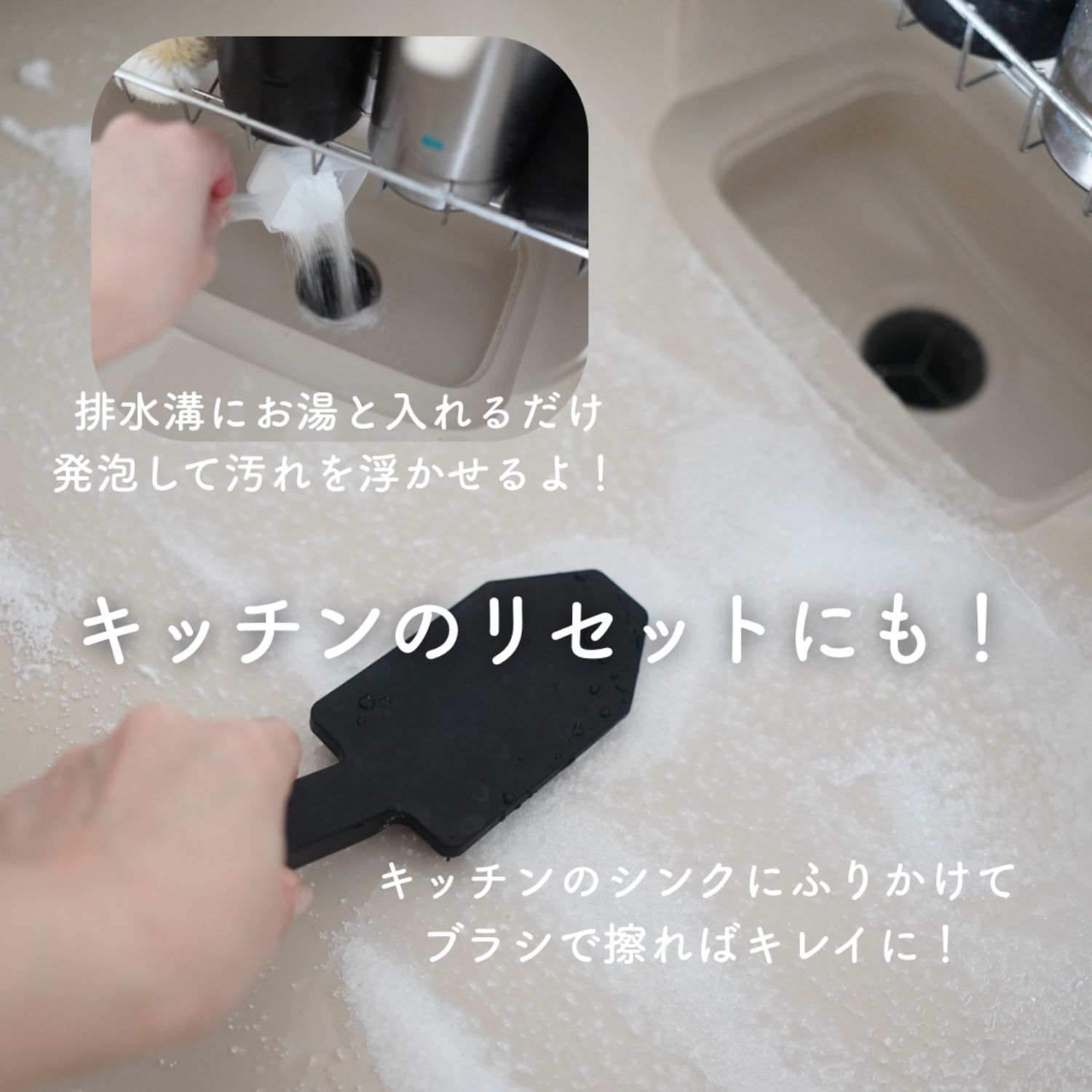 洗浄液としてさまざまなシーンで使用できるのはもちろん、クレンザーとして、 布巾に浸み込ませて手軽なお掃除に、浴槽やシンクにお湯を溜めて 気になる汚れ物を一気に洗浄する“酸素漬け”など、マルチに活躍できそうです。