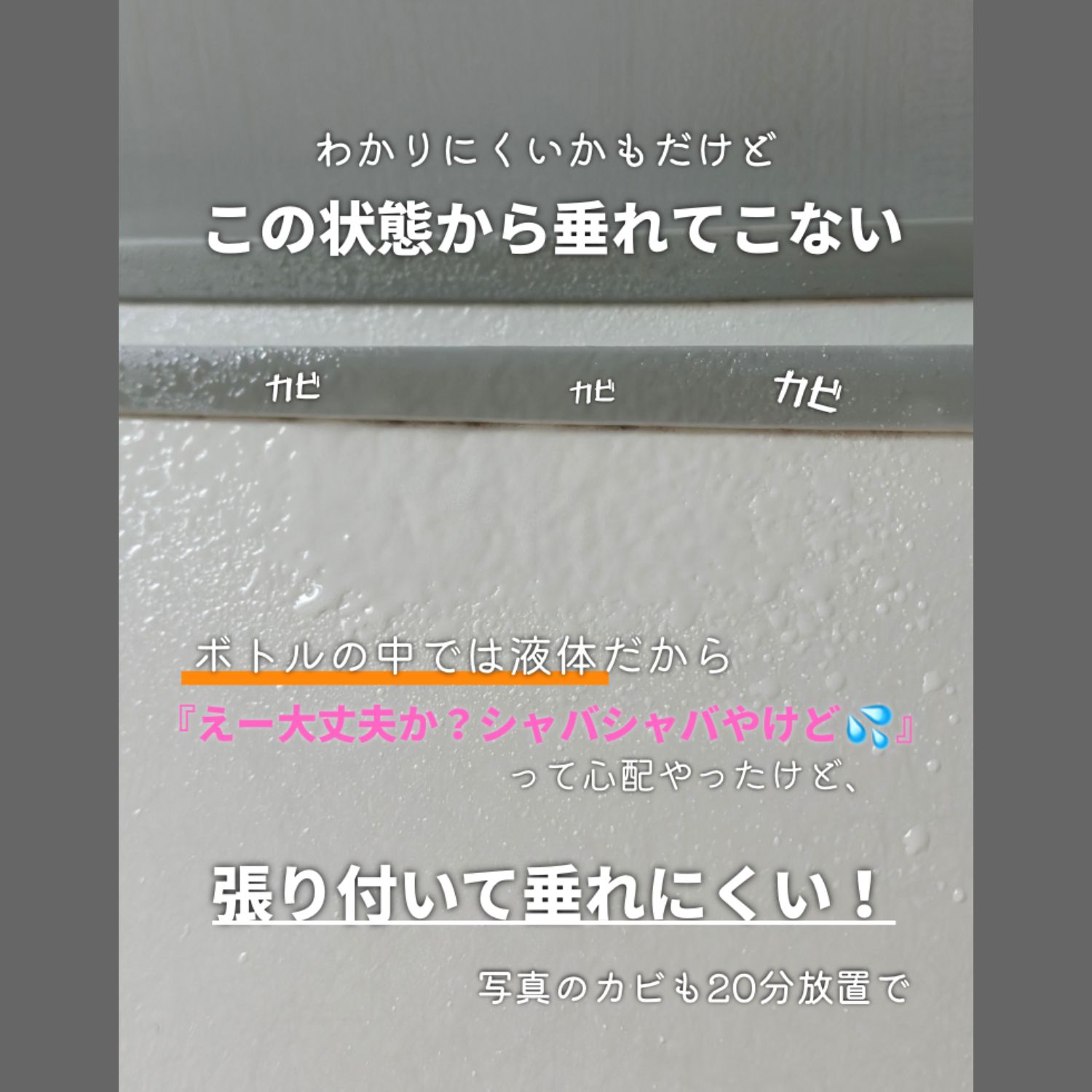 もともと接着剤などを作っていた、液体を増粘させる技術に長けた企業の技術者が、 自前の技術を応用し、家庭でもしっかり汚れを落とせるカビ取り剤を目指して開発した一品です。