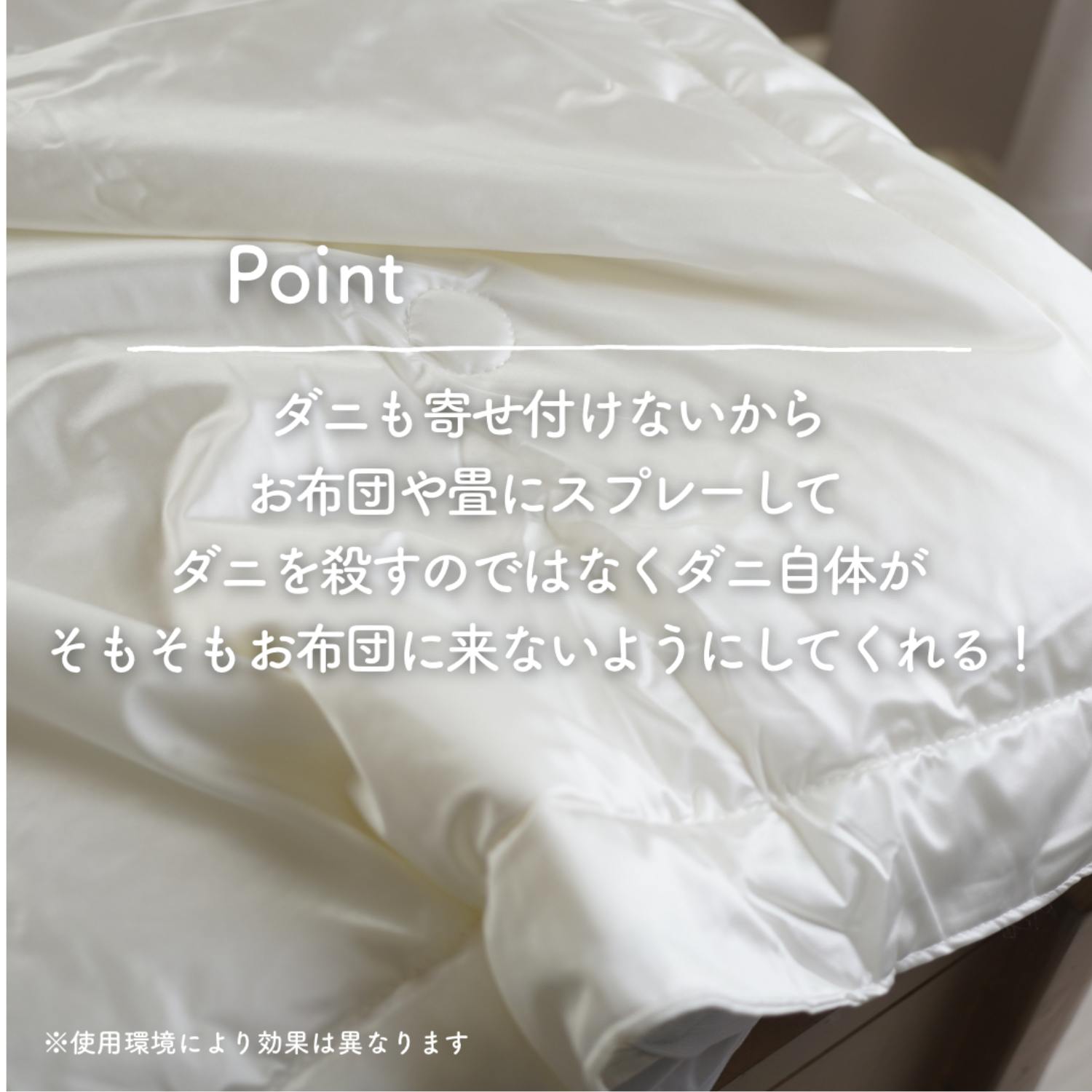 成分は青森産ヒバとヒノキから抽出したヒノキチオール、クスノキ・ヤシ・杉・松から抽出したテルペン精油、菊から抽出した除虫菊エキスで構成したこだわりの成分です。