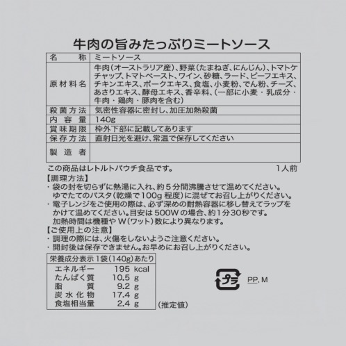 ミートソースは昔、洋食レストランなどで出されていた、なじみがある料理。本品は牛肉たっぷりの旨みと、トマトを使ったソースのコクが後を引く一品です。日本人の口に合う、どこか懐かしい味わいに仕上げました。牛肉を100%使用。その中でも、旨みが強い肩肉を使いました。玉ねぎは国産に限定して使用。食感が良く、香りと甘みが引き立つものを厳選しました。ソースにはトマトペーストにトマトケチャップを加えることで、さわやかな酸味を出しました。湯せんなど、温めるだけで、レストランで食べるような本格的な味わいを、ご家庭でお召し上がりいただけます。