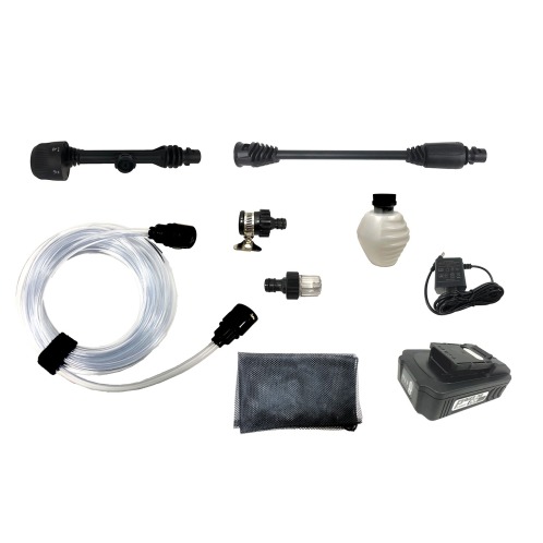 ・本体(型番:CHPW-1822)、リチウムバッテリー、充電アダプター、給水ホース、6in1ノズル、延長ランス、泡洗浄ボトル、蛇口ニップル、給水ホースフィルター、収納バッグ