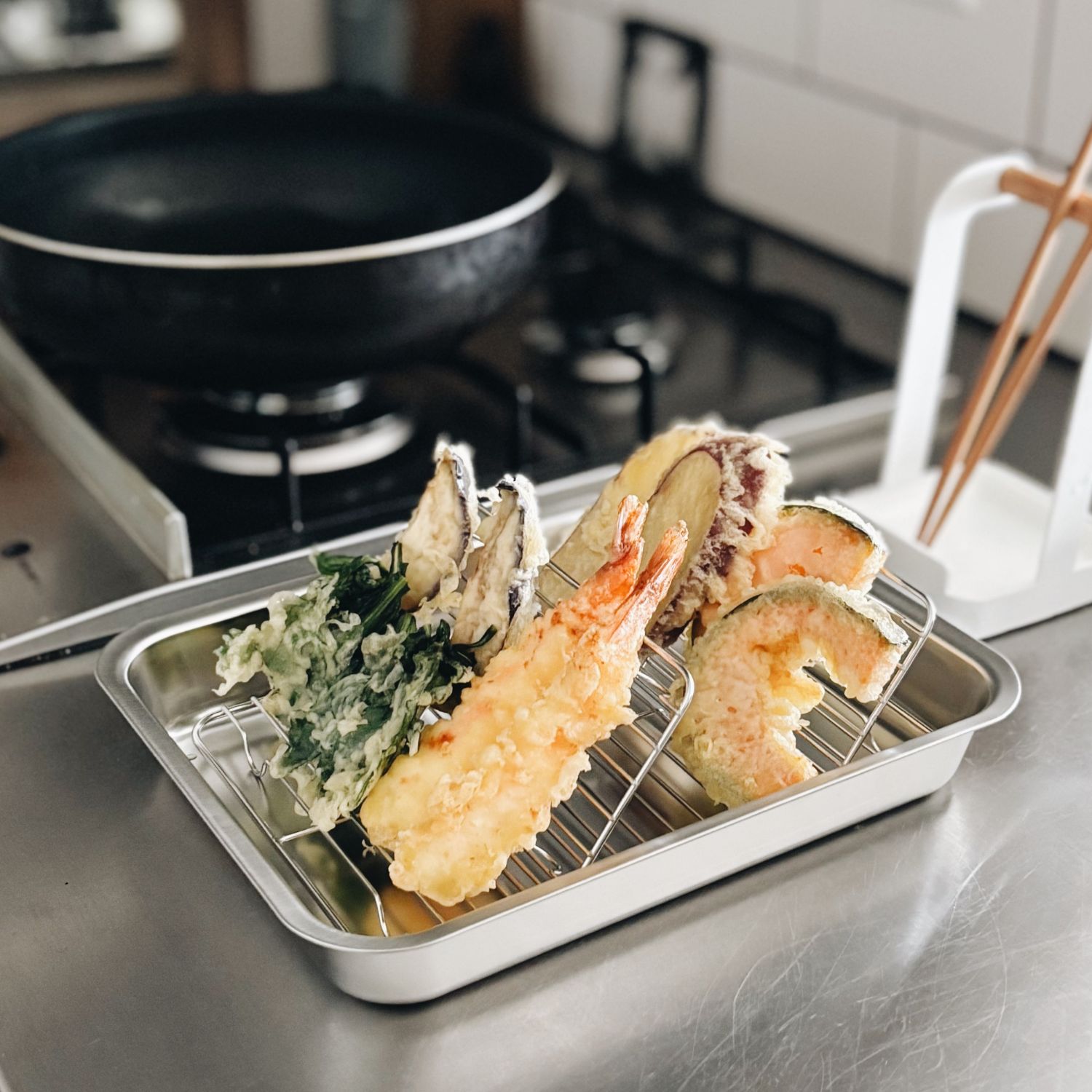 また、バット網(大)にバット網(小)を差し込むことで、揚げ物を立てて油切りすることも可能。
