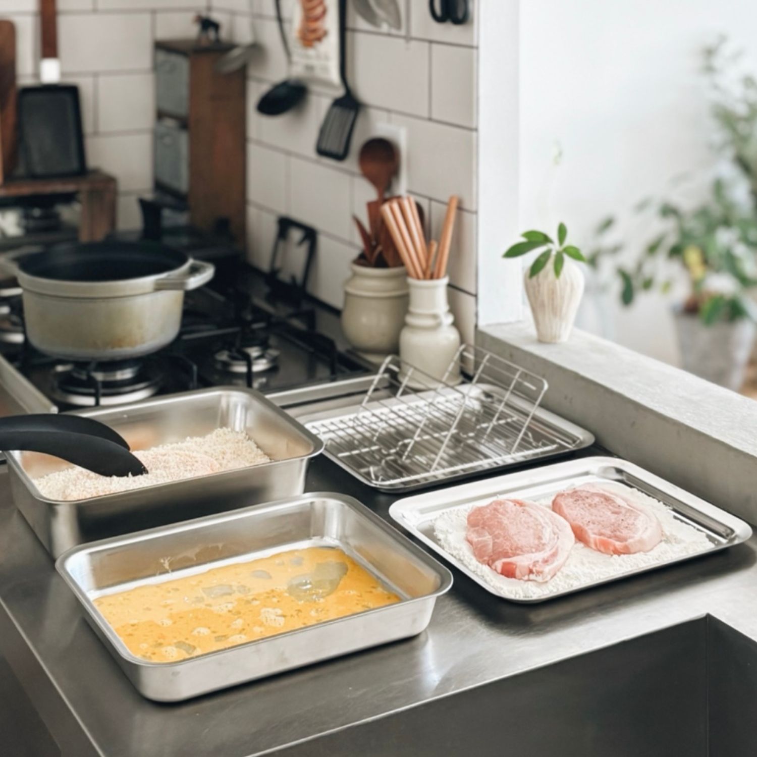 フタ付バットは食材の漬け込みや保存、揚げ物の衣付けに便利。