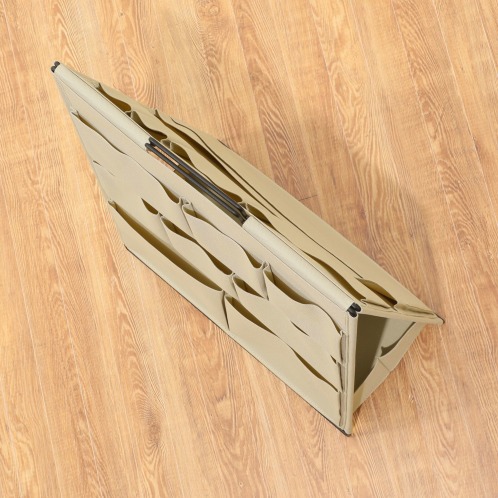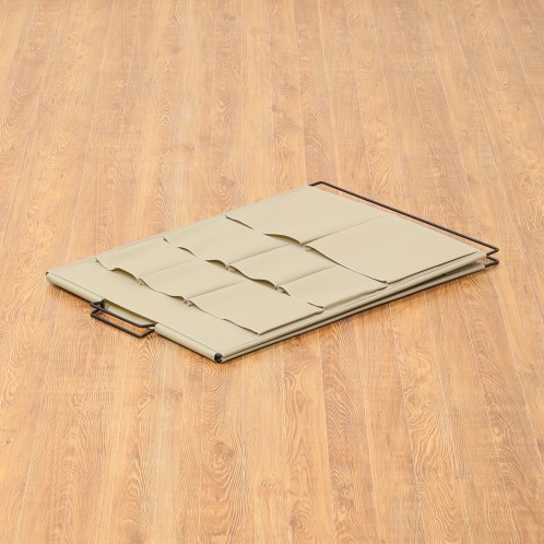 ・畳んだ状態から、本体を開き、底板が地面と並行になるように設置すると、ポケットには入りきらない、大きい物などの収納ができる仕様。