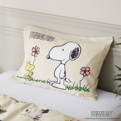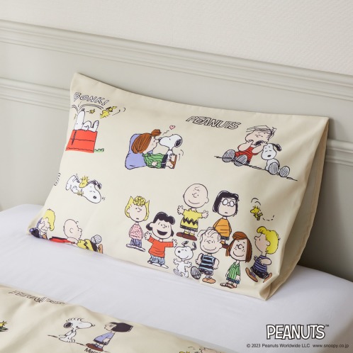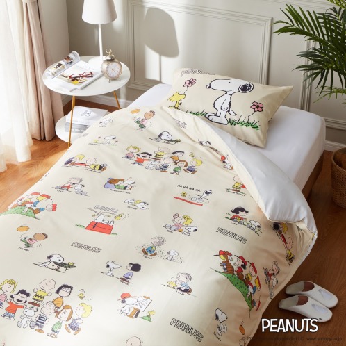 <西川>より、ピーナッツに登場する個性豊かで魅力的な仲間たちのデザインが楽し気な雰囲気の、掛けふとんカバーとピローケースです。