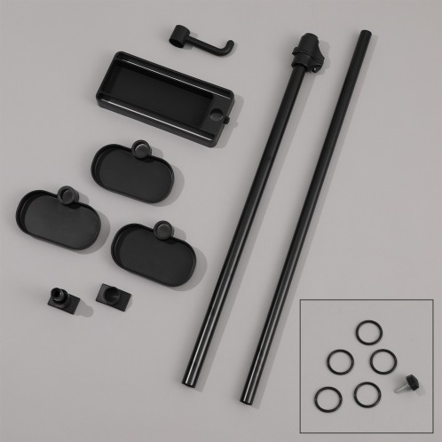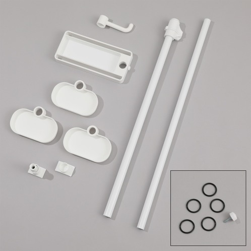 ・ポールセット、ミニトレイ(25mm用)、ミニトレイ(28mm用)×2、長方形トレイ、ミニフック、上部固定盤、下部固定盤、ゴムリング×5、安全ボルト、固定ピン(ポールセットに装着済) ※組立式(工具不要)