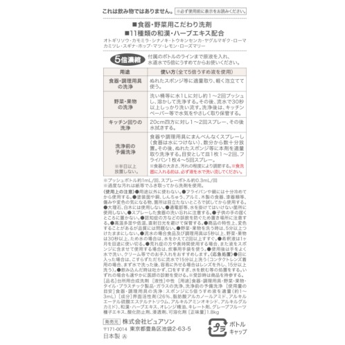 (オトギリソウ・カモミラ・シナノキ・トウキンセンカ・ヤグルマギク・ローマカミツレ・スギナ・ホップ・マツ・レモン・ローズマリー)野菜洗浄・手肌の事を考え、界面活性剤の配合量を最低限に抑えましたが納得のいく洗浄力で被膜も残りづらいです。