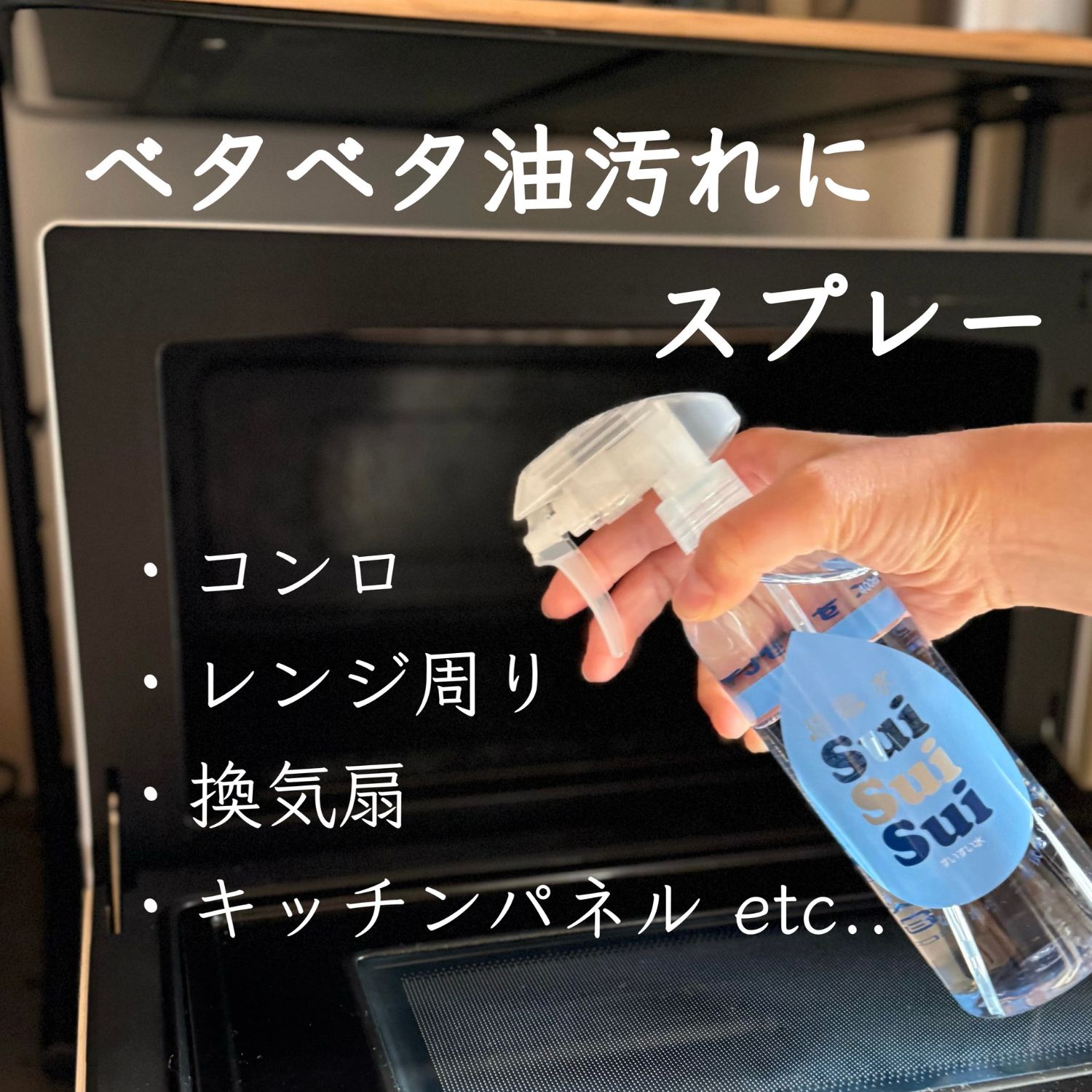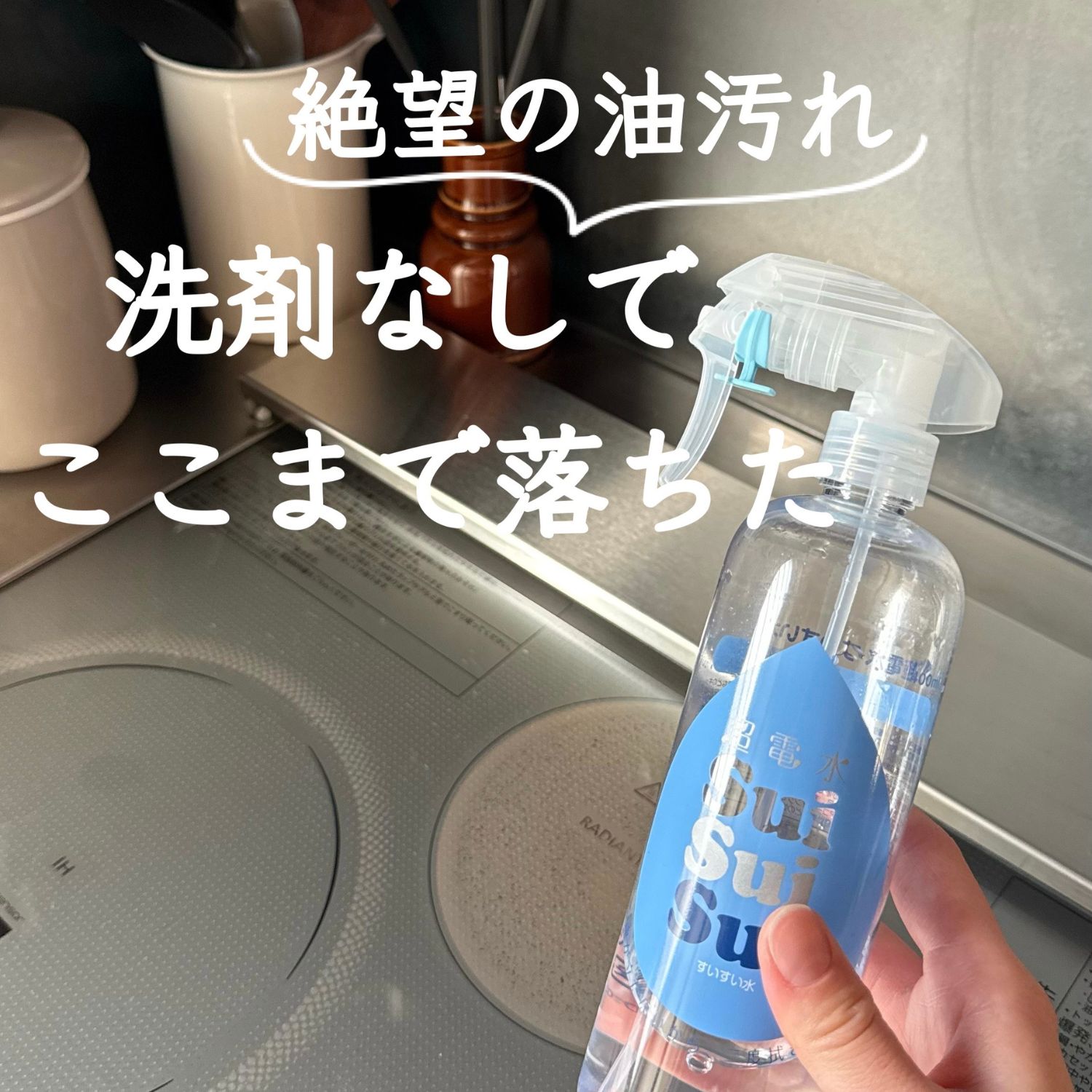 界面活性剤や酸、リン、香料、石油系成分などを一切含まない電解アルカリ水100%の汚れ落とし、楽にスイスイ、短時間でお掃除できる「超電水 すいすい水」。