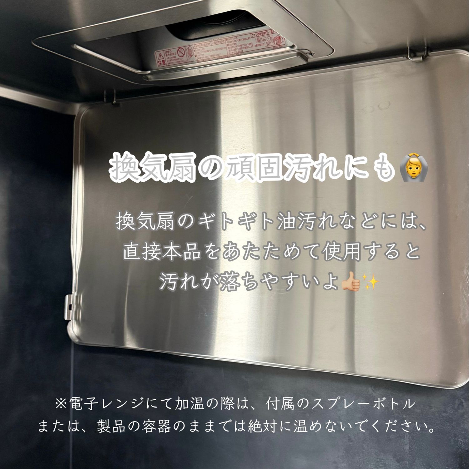 換気扇のようなしつこい油汚れなどには、直接本品をあたためて使用することもできます(電子レンジにて加温の際は、付属のスプレーボトルまたは、製品の容器のままでは絶対に温めないでください)。