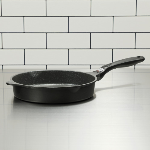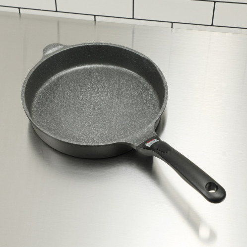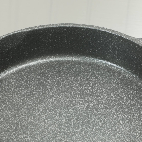内面は3層フッ素の細やかな石目模様、底面平面部は約22cmと広く設計。