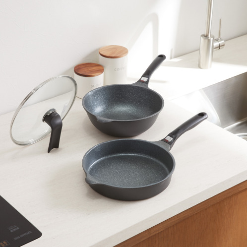底丸パンプラスのガラス蓋が使用できるので、対照的な2つのフライパンをそろえていただければ幅広くいろいろな料理にお使いいただけます。