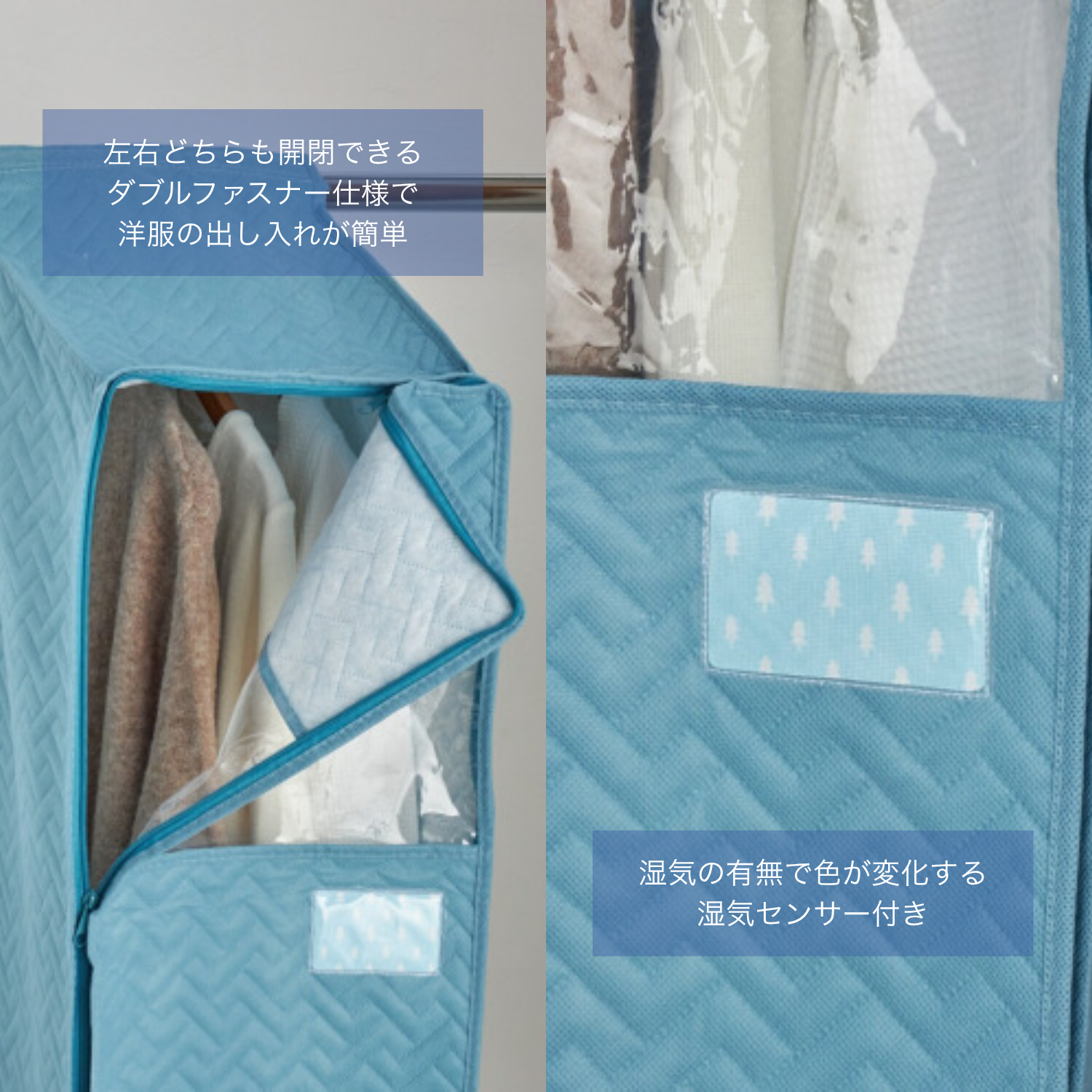 左右どちらからでも開閉できるダブルファスナー仕様でカバーが大きく開くため、洋服の出し入れが簡単です。