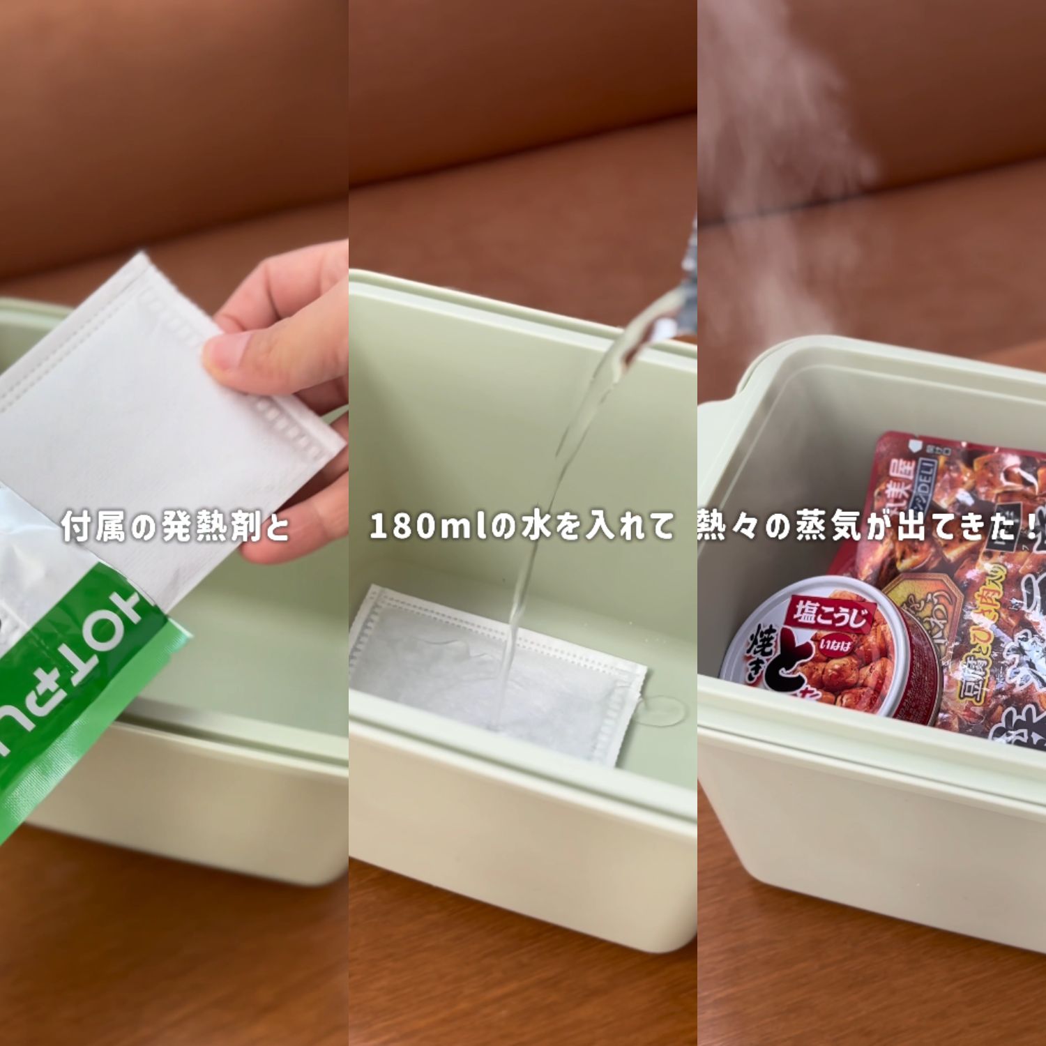 専用の発熱剤に水を注ぐと発生する高温の蒸気で、ボックス内の食品を短時間で温めることができます。