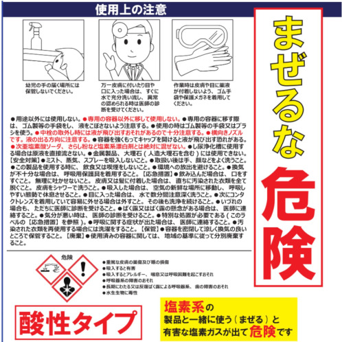・<まぜるな危険>塩素系の製品と一緒に使う(まぜる)と有害な塩素ガスが出て危険。