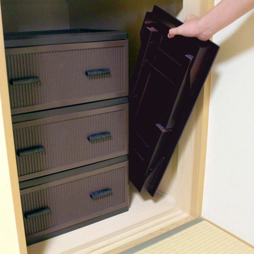 棚板を脚部内に収め折りたためるので、ちょっとした隙間に収納できます。