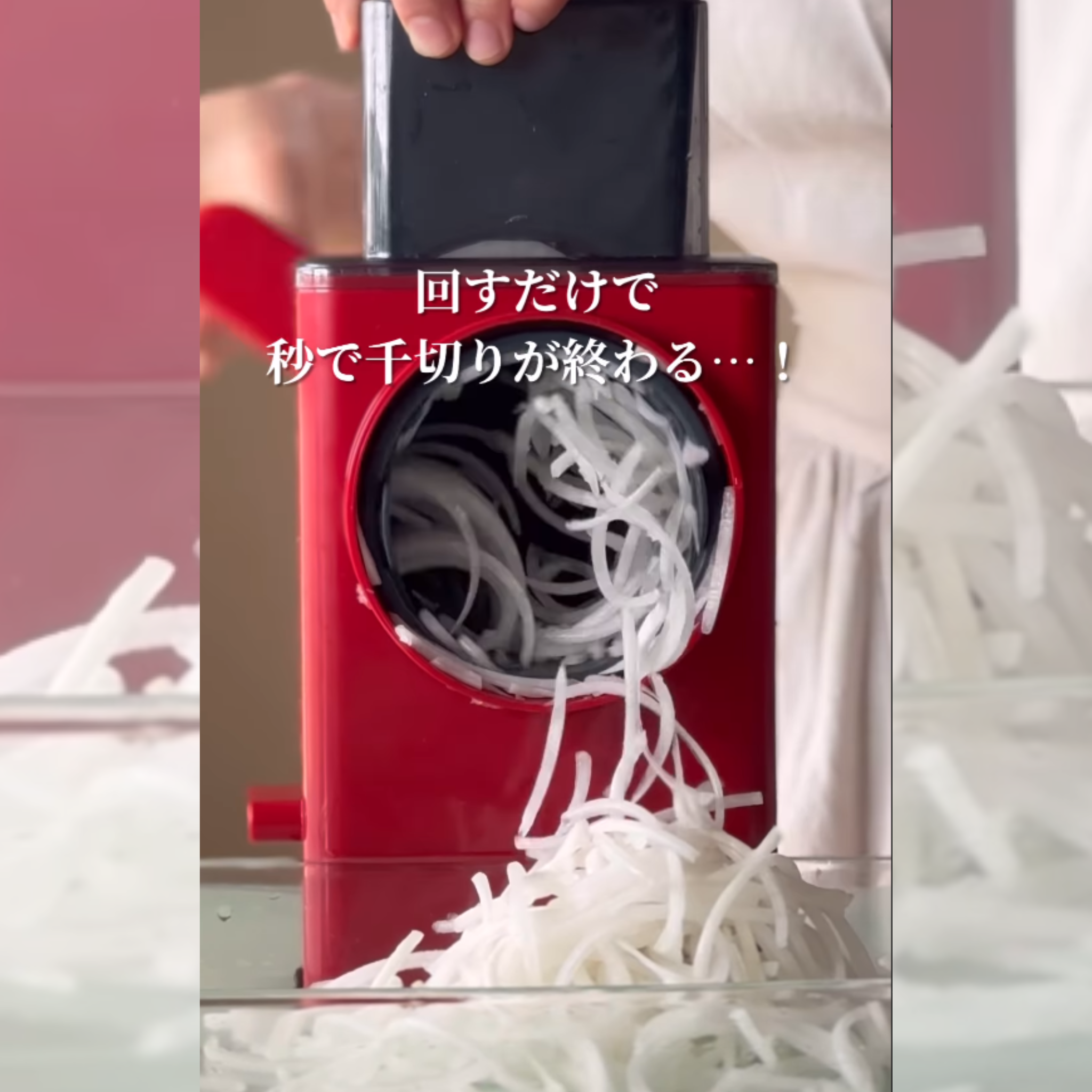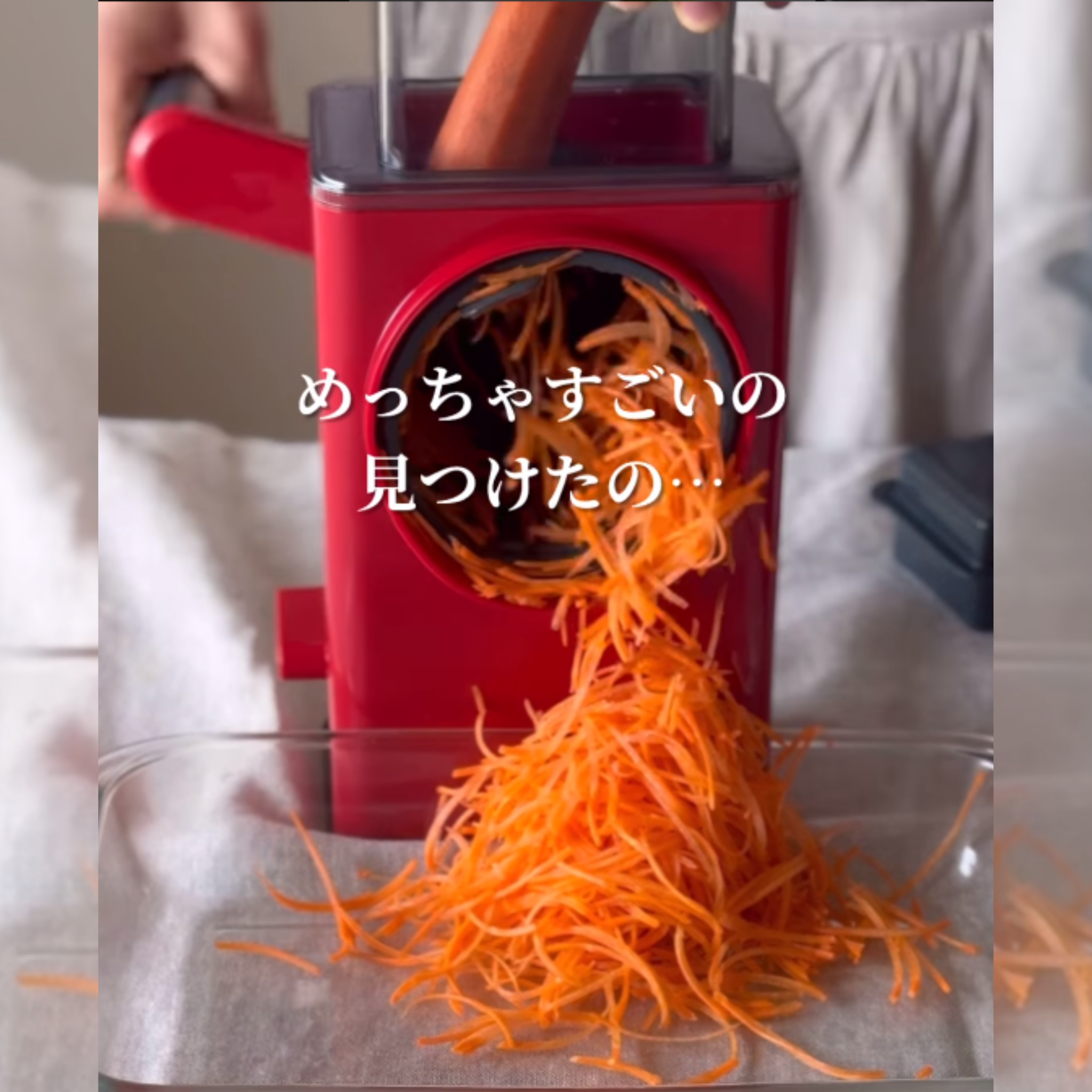食材を入れて、ハンドルをくるくる回せば、アッと驚くような早さで面倒な下ごしらえが楽に楽しくできるキッチンアイテム「くるくるドッカーン!回転マルチスライサー」のご紹介です。