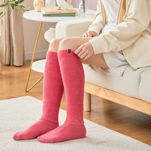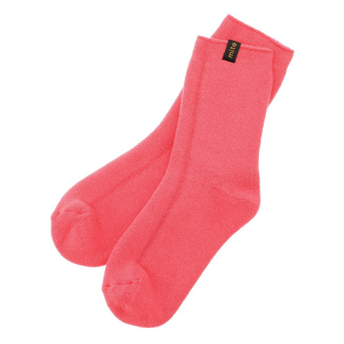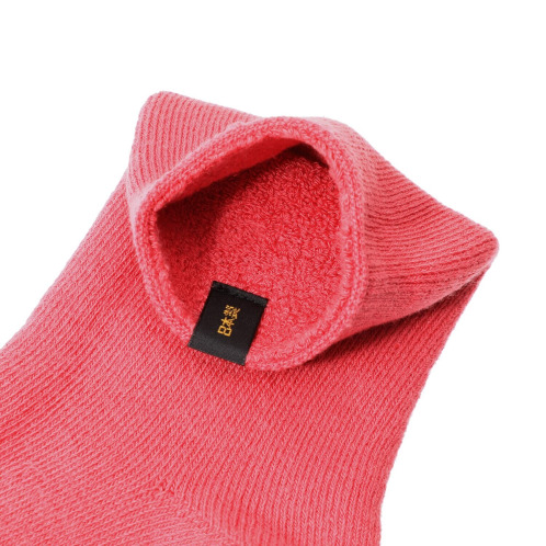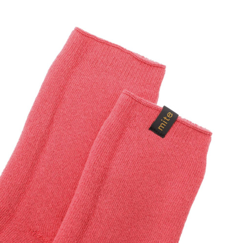 肌に当たる面は柔らかなパイル編み、外側の面はリブ編みになっており、空気をたっぷり含んで足の熱を逃がさないような構造。