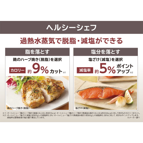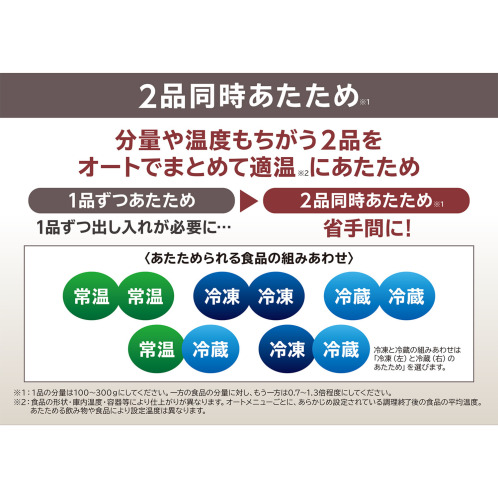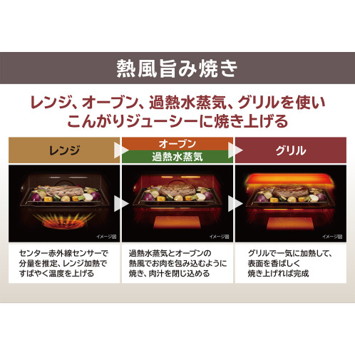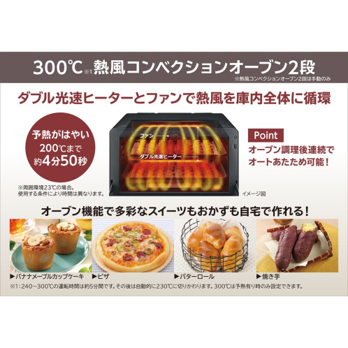 メーカー独自のセラミックプレートと熱風で食材を包み込み一気に加熱し焼き上げる「熱風旨み焼き」、食品の重さと温度をはかって加熱のパワーや時間をオートでコントロールする「Wスキャン」、ダブル光速ヒーターとファンで熱風を庫内全体に循環させ包み込むように焼き上げる「300℃2段熱風コンベクションオーブン」など、多彩なメニューを搭載。