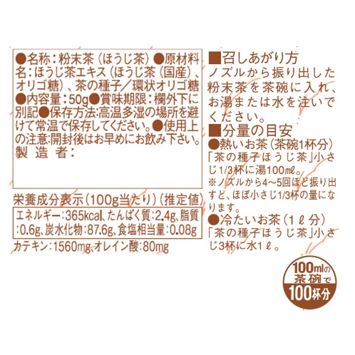 厳しい品質管理と独自の技術力の茶エキス製造専用機がある工場で作られた、国産の焙煎茶葉を使用した「ほうじ茶エキス」(スプレードライ)の粉末を「茶の種子」と合わせました。