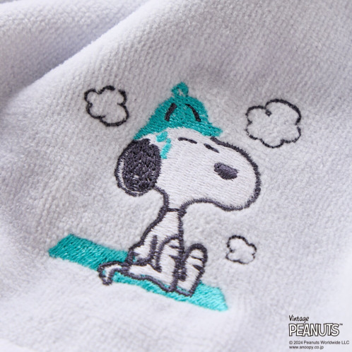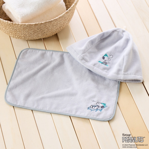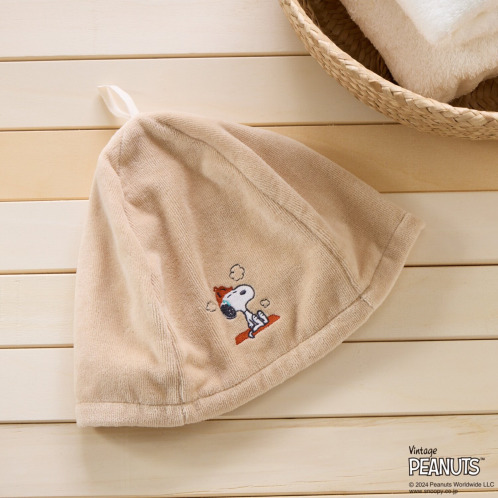 サウナハットを使用しているスヌーピーと一緒に、サウナタイムを楽しみませんか。