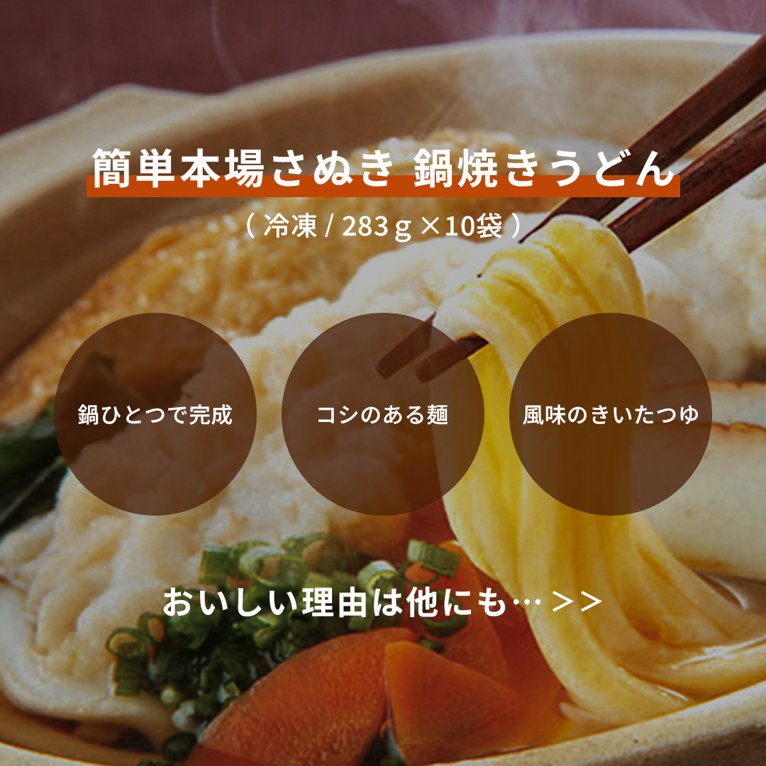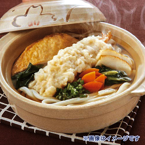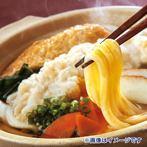 国産小麦を使用したコシのある麺に、かつおや昆布など、風味のきいた鍋焼きうどん専用のつゆが絡まり、讃岐うどんのおいしさをご堪能いただける逸品です。