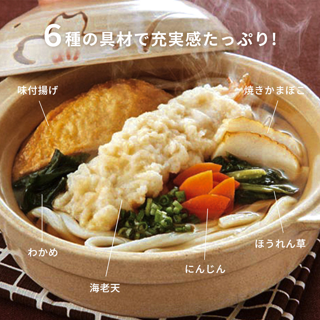 6種の具材が入った鍋焼きうどん「簡単本場さぬき鍋焼きうどん」のご紹介。