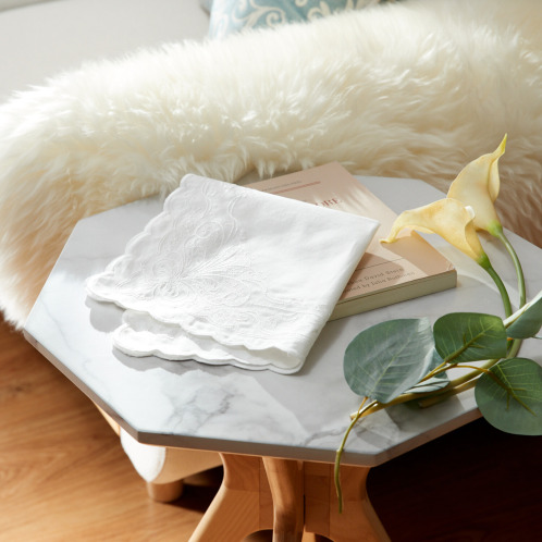 生活の中で実際に使うハンカチを想定した、使いやすい大判サイズで、周囲はレースのような優雅なフリル仕上げ。