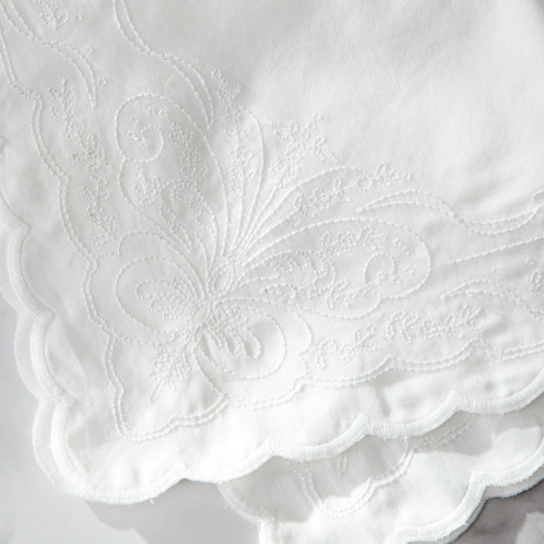 清潔感のある純白の綿100%の生地に、手刺しゅうのような繊細さを表現できるように、細番手のポリエステル糸を 用いて、刺しゅうをほどこしました。
