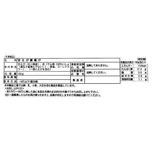 素材の味を活かすメーカーオリジナルの唐揚げ粉を使用し、粉付けした状態でお届けするので、ご家庭では揚げるだけで殻ごと甘海老をお召し上がりいただけます。