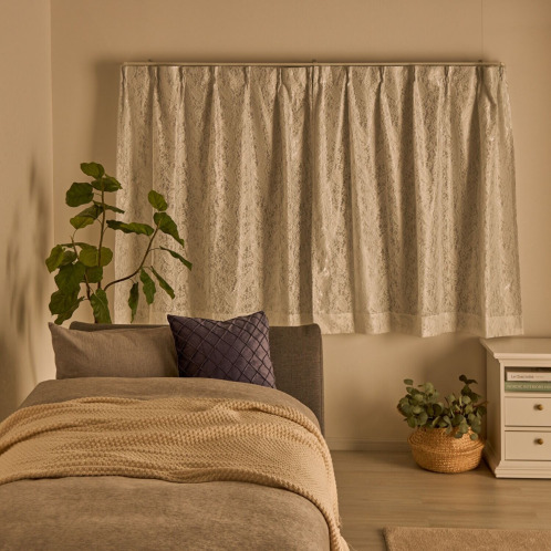 アルミ本来が持つ遮熱(断熱)性や紫外線・赤外線反射機能と、繊維が持つ柔らかな質感や、通気性が一体となった、高性能テキスタイル(エコファイン)を裏側(窓側)に、クラシカルなレース素材の生地を表側(室内側)に組合わせた、2重レースカーテンです。