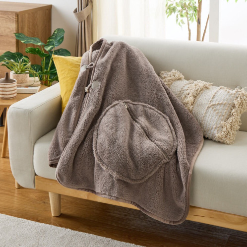 ひざ掛けとしてはもちろん、肩から羽織ってショールのように、さらに留め具を使えばポンチョとしても使用できる優れもの。