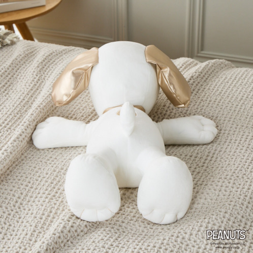 <西川>より、耳・鼻・首輪・背中の生地にゴールドカラーを配したゴージャスで、思わず抱きつきたくなる可愛らしいスヌーピーの抱きまくらです。