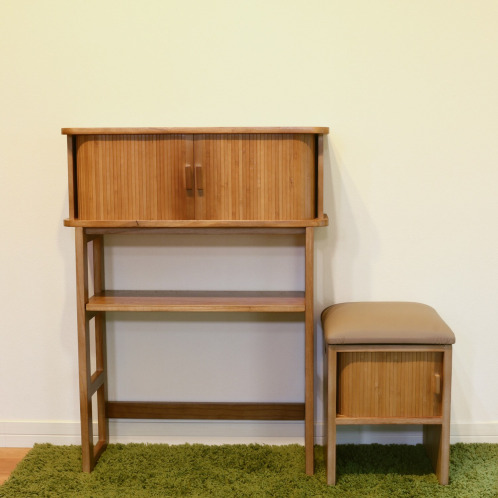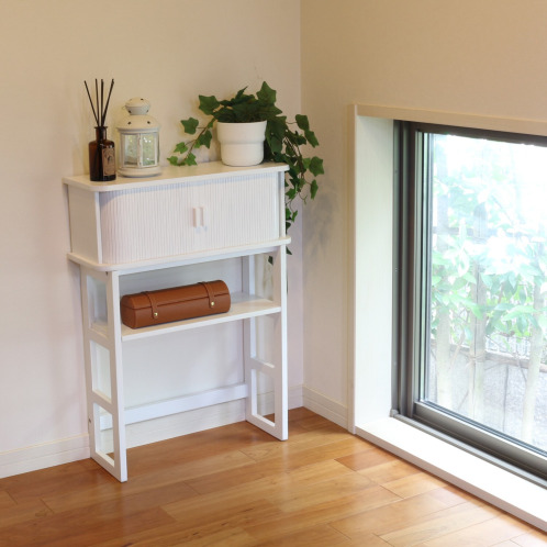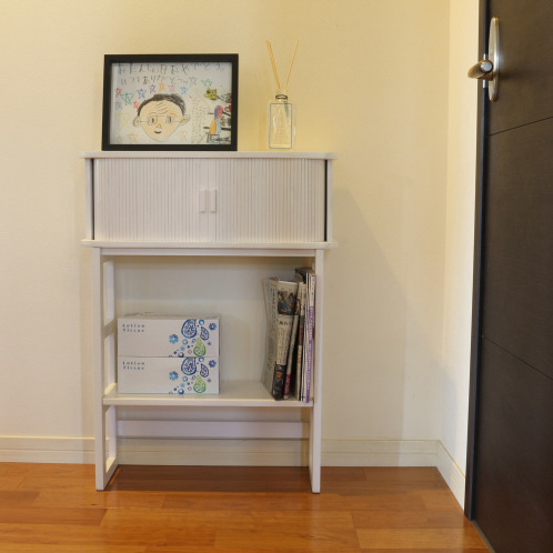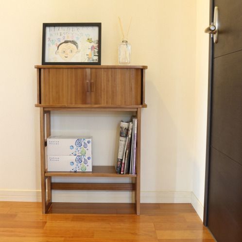 リビングはもちろん、廊下のような狭い場所にも設置でき、こまごまとしたものをすっきり、おしゃれに収納!竹製のジャバラ扉も最後まで大きく開くので、奥にしまった物も見やすく、取り出しやすいのもポイントです。