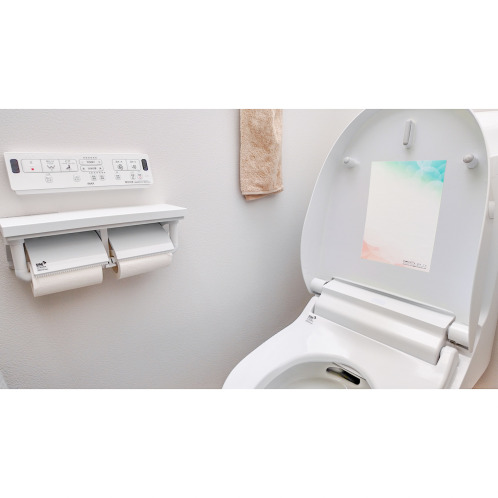 蓋を閉めて流すことでエアロゾルの飛散を抑えつつ、本品をトイレの蓋に貼付することにより、シート表面に付着したウイルスを抑制、菌の増殖を抑制。