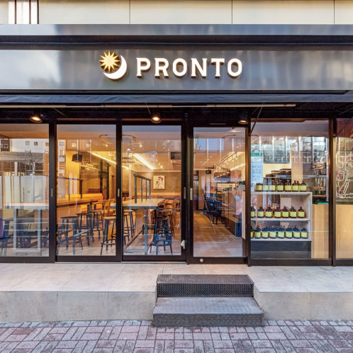 “PRONTO(プロント)”は、“昼はカフェ、夜はサカバ”という“二面性”をキーワードに、働く人がいつでも立ち寄れる、使い勝手の良い空間を一日中ご用意しています。
