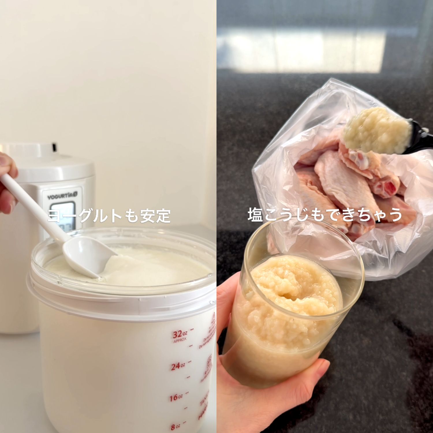 360度側面ヒーターと0.1℃単位の精密温度管理(但し温度設定は1℃単位)により、ヨーグルトはもちろん甘酒、塩麹などの発酵食品を簡単に作れます。