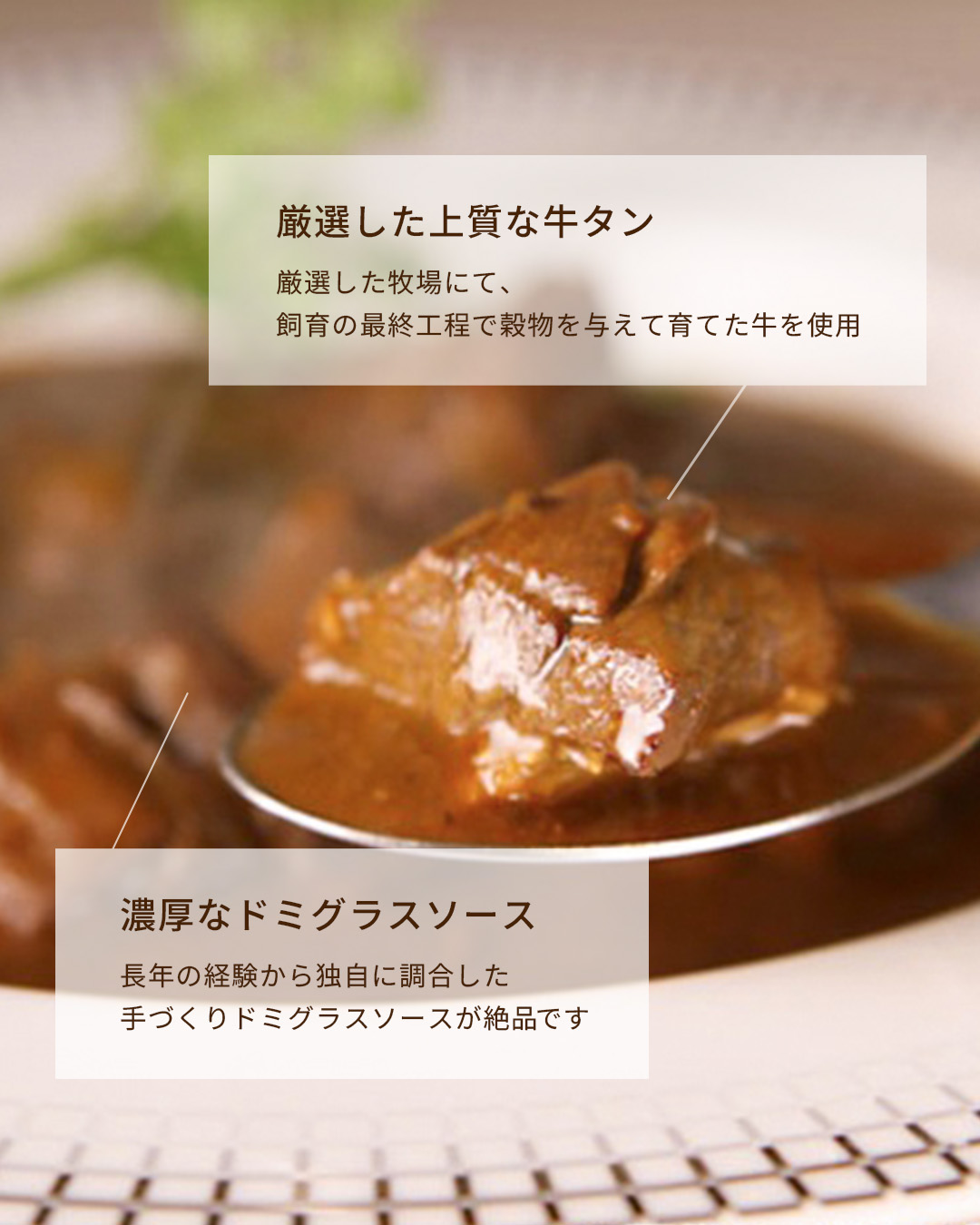 お店の味わいをそのままに、ショップチャンネルオリジナルで、牛タンの表面を焼き、旨みを閉じ込める工程を加えた本格的なシチューを、ご家庭で湯煎するだけで味わうことができます。