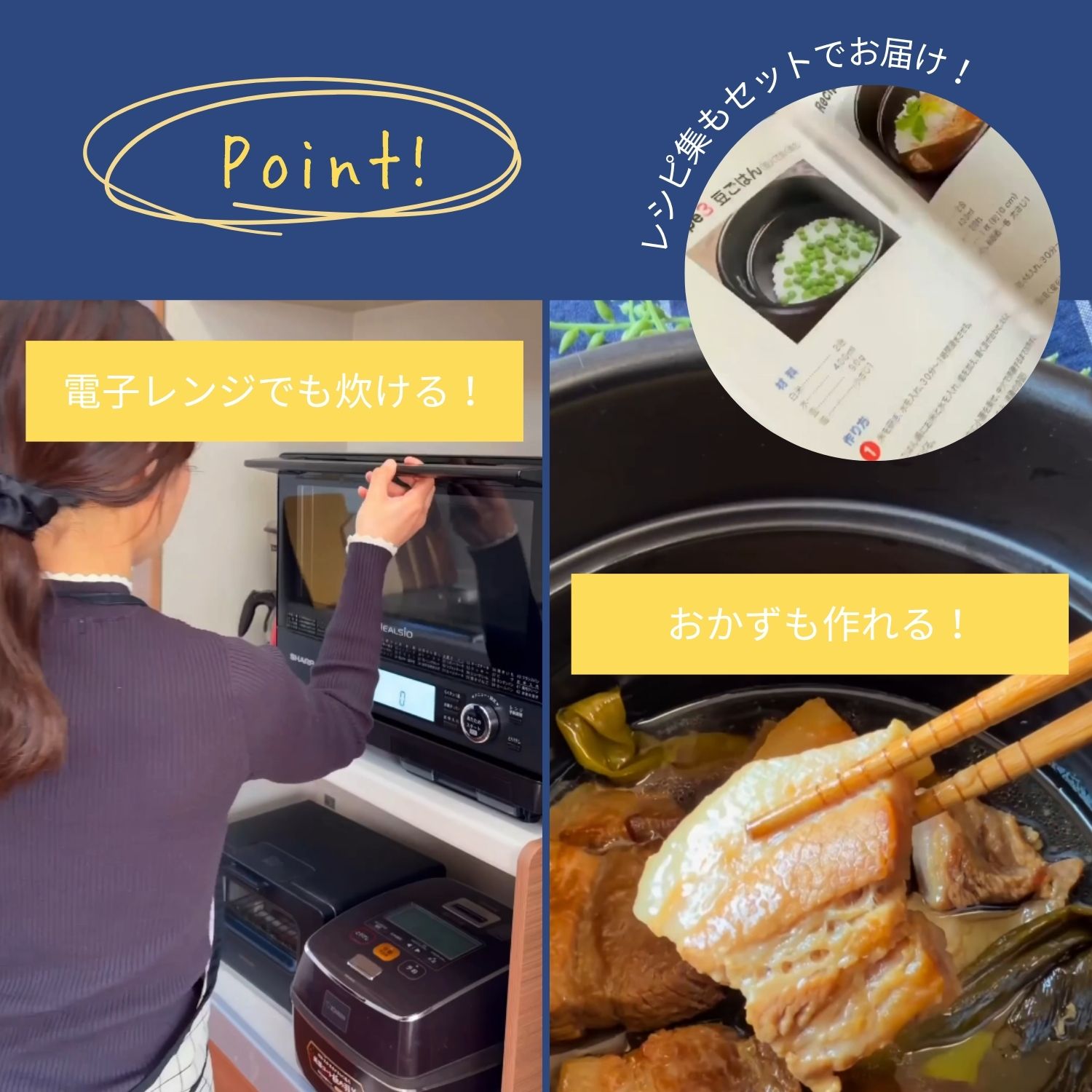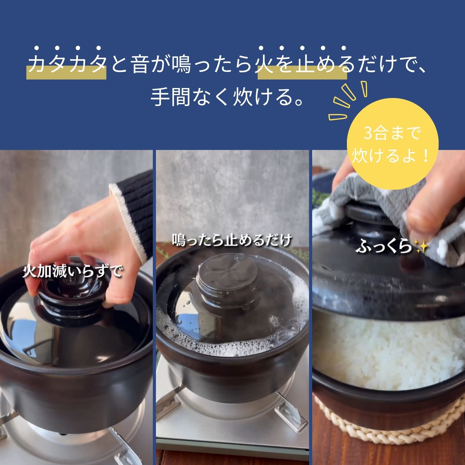 直火・電子レンジ対応の「究極のごはん鍋HACHI」のご紹介です。火加減いらずで、吹きこぼれなく、おいしいごはんが3合まで炊けます。蓋のつまみに乗っている小蓋によって適度な圧がかかり、カタカタと音が鳴ったら火を止めるだけで、手間なく炊くことができます。鍋本体は遠赤外線放射が高い釉薬を使用。熱伝導により、短時間調理が可能となり、直火の場合、わずか約8分火にかけるだけで2合を炊くことができます。※別途吸水、蒸らしの時間が必要です。蓄熱性が高く、火を消した後も数分間沸騰が続きます。蓋の裏には螺旋状の突起が施されており、蒸気を逃がさず、蒸気の水滴がまんべんなくごはんに落ち、おいしく炊くことができます。特殊耐熱陶土に新開発の釉薬を施釉し、お米の芯まで熱が通り、ふっくらしたごはんが炊けます。ごはん炊き以外にも煮物料理などの調理が可能。レシピ集もセットでお届けします。