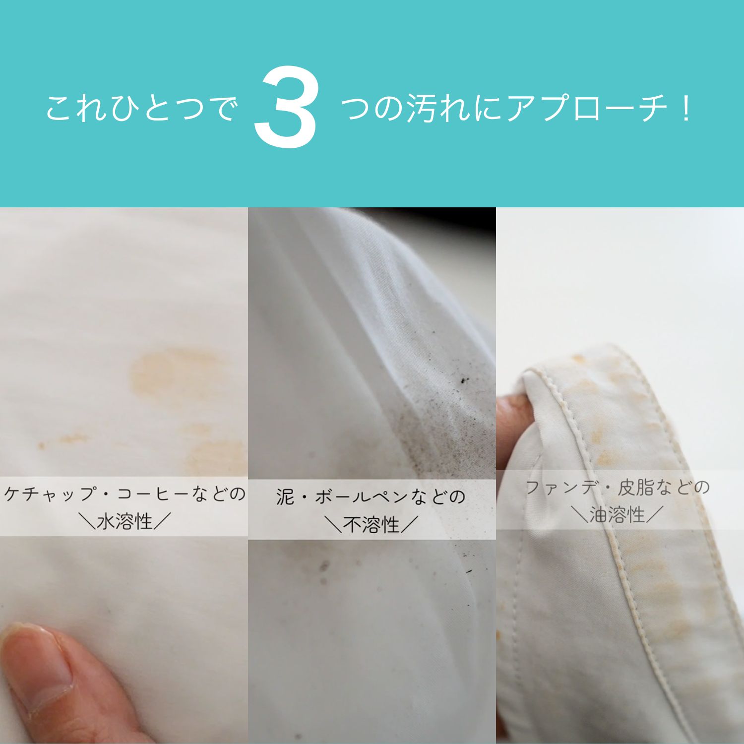 油性の汚れに強くさらに洗浄成分、界面活性剤および酵素配合で、水溶性・不溶性の汚れもスッキリ!水溶性・不溶性・油性の3種類の汚れを同時に落とすことができる洗濯洗剤です。