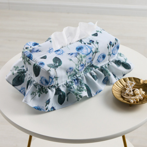 ティッシュカバーは切り替えフリル付きの特別デザインで、さまざまなサイズのボックスに対応。