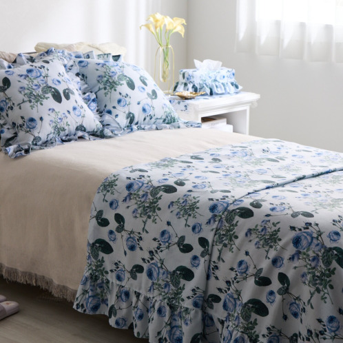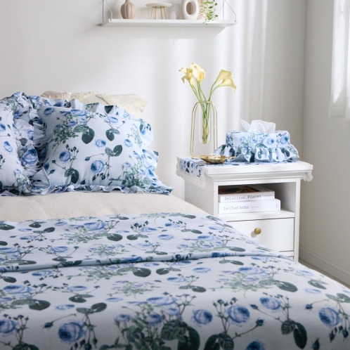 爽やかなブルーのルドゥーテの薔薇を主役に据え、デジタルプリントの繊細な多色使いにより、グラデーションや写真のようなリアルな薔薇柄を鮮やかに再現した当ブランドオリジナルファブリックを使用。