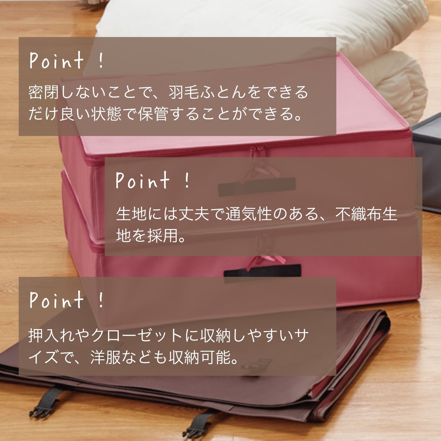 <西川>より、お手持ちの羽毛ふとんをより長く使っていただくことを考え、ふとん屋が羽毛ふとんのために考えた収納ハードボックス。
