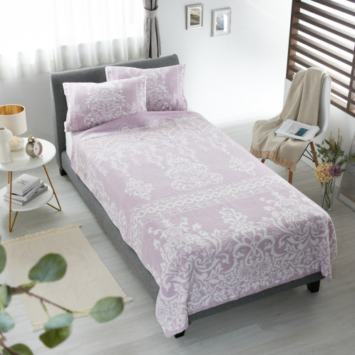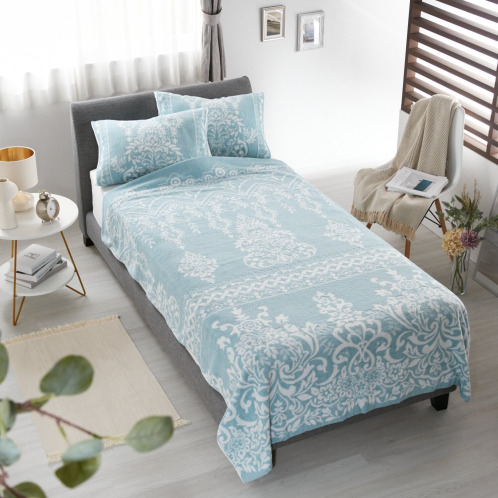 西洋のヴィンテージレースに着想を得たオーナメントパターンに花模様を配しジャカード織で織り上げた、エレガントなデザインは、寝室をクラスアップしてくれそう。