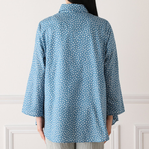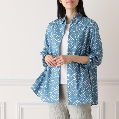 台襟付きのシャツカラーと、裾に向かって広がるAラインのゆったりとしたシルエットが、気になる体型をさりげなくカバー。
