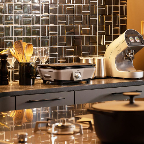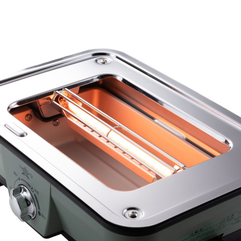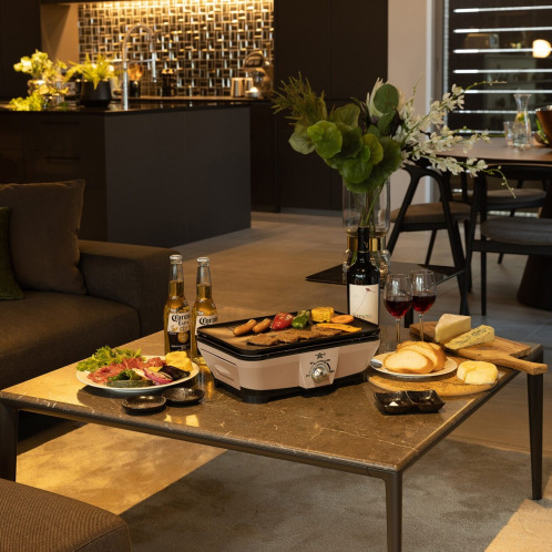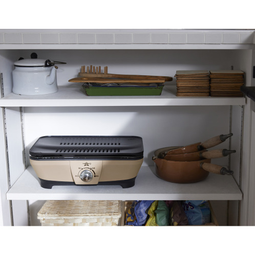 予熱が速く、短時間で備長炭相当の約1,300℃まで高温になるため、ヒーターから出る輻射熱と、温まったプレートによる伝導熱、プレート下の熱気による対流熱のトリプル効果で、食材に余計な熱を与えず、素早くこんがりと、中までふっくら焼き上げます。