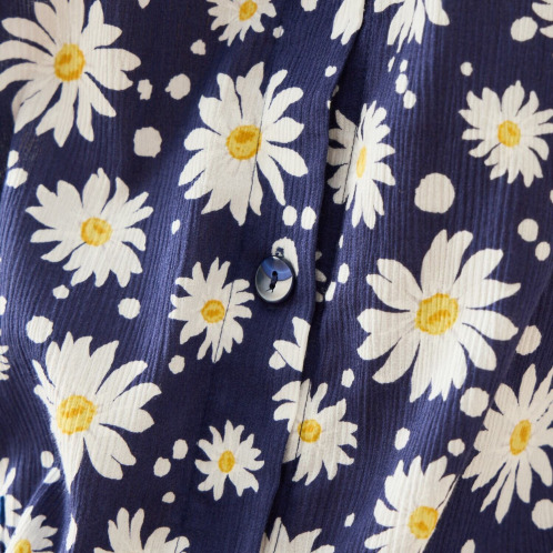 トップスは可憐なマーガレット柄をプリントし、襟ぐりにサテンのバインダーとギャザーをほどこして女性らしい印象に。